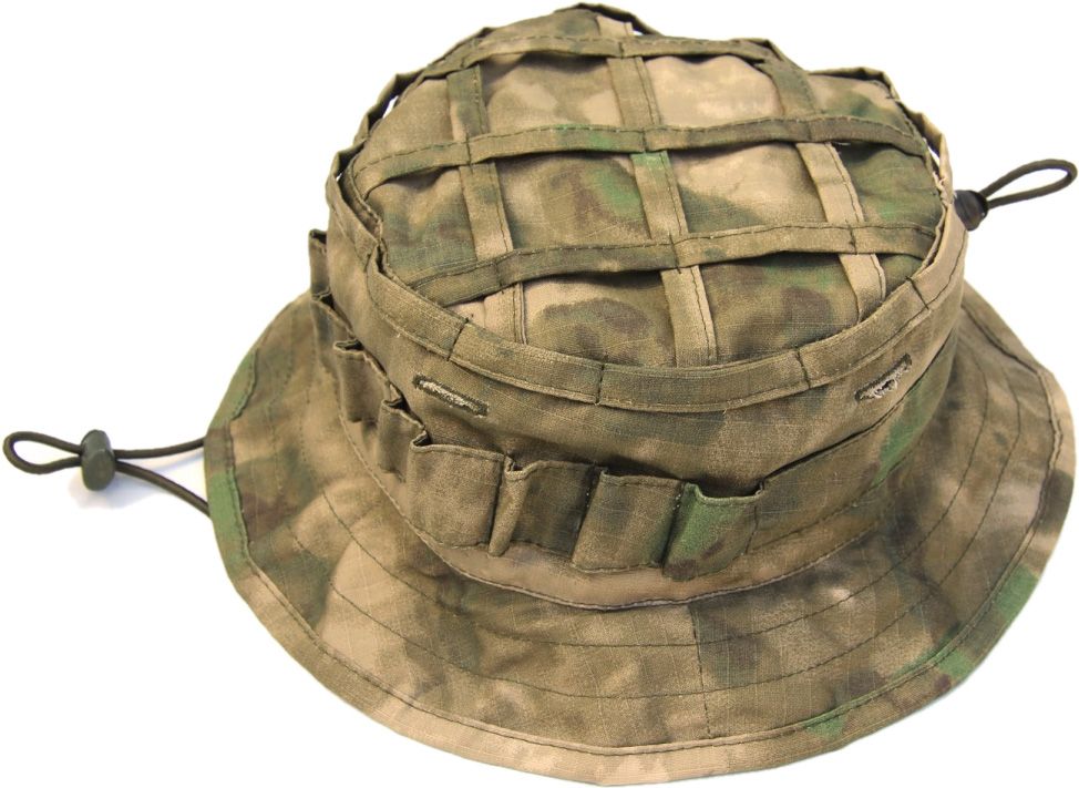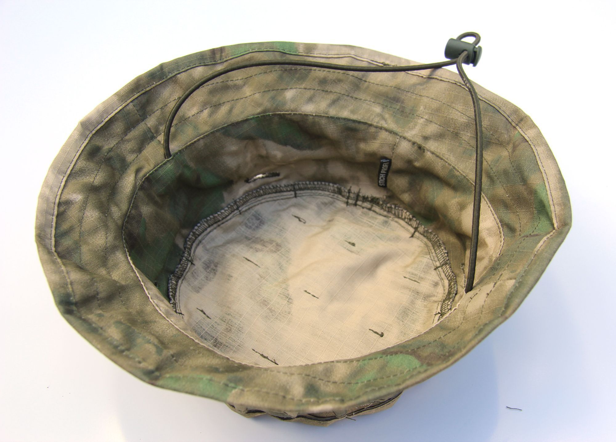 Лента настроченная на тулью и дно панамы может быть использована для крепления дополнительной маскировки (ветки, пучки травы,...). Облегченная конструкция панамы способствует большей воздухопроницаемости.